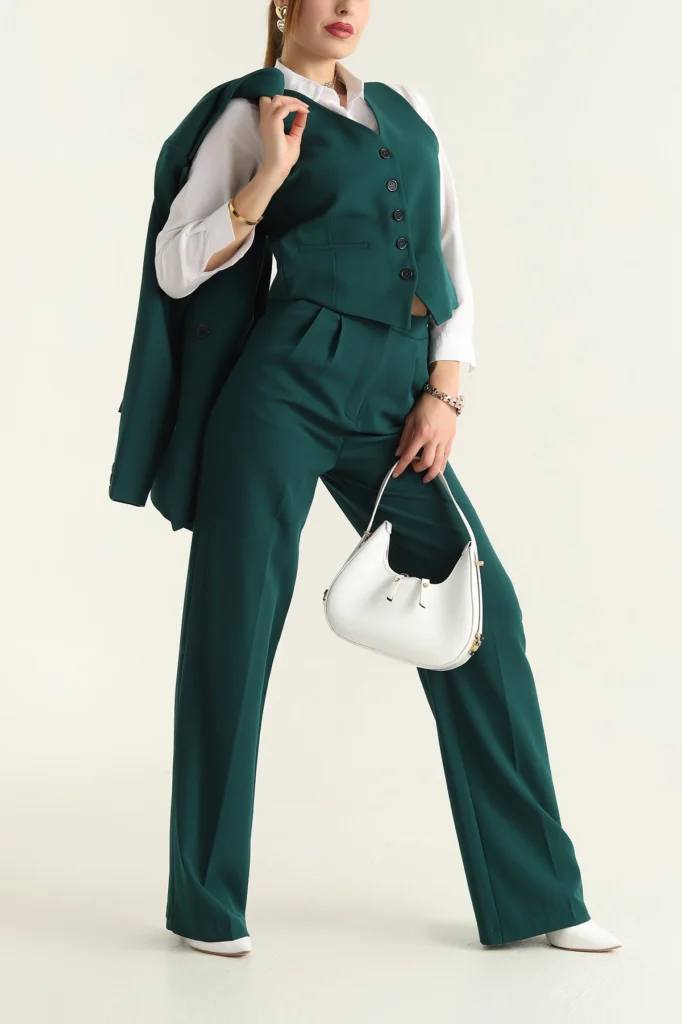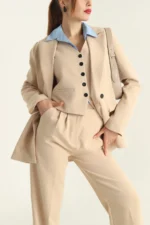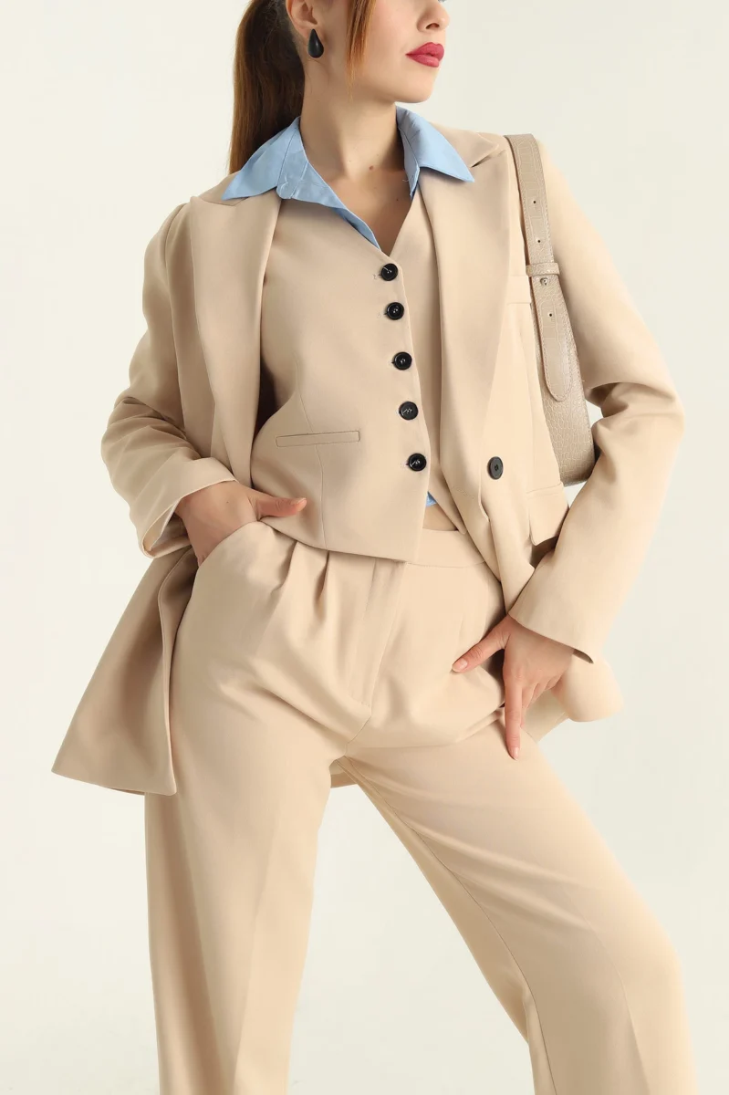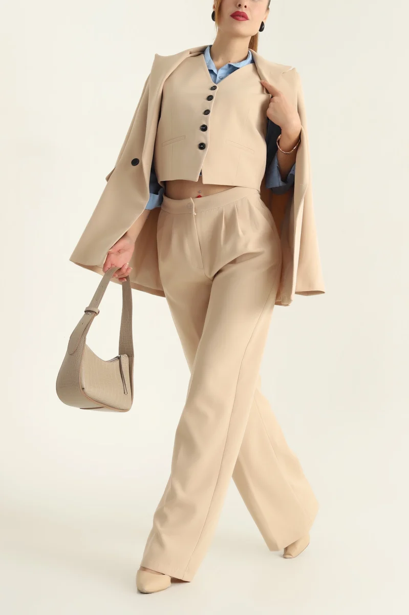 Upgrade your wardrobe with this timeless 3-piece women’s suit set, designed for elegance and confidence. The set includes a tailored blazer, a fitted buttoned vest, and wide-leg high-waist pants. Made with high-quality fabric, it combines comfort with a polished professional look.